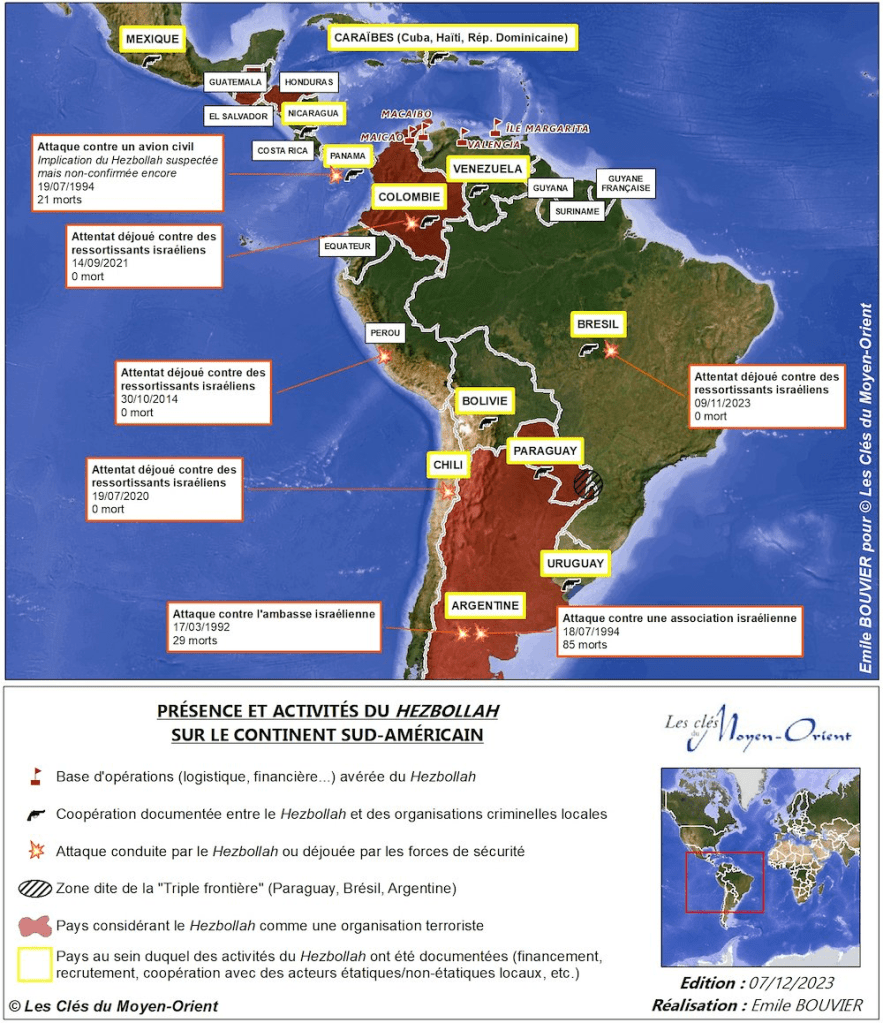 - Bouvier, E. (2023, 21 décembre). L’Amérique latine, inattendue caisse de résonance du conflit israélo-palestinien : l’Amérique latine, base arrière du Hezbollah (en ligne). Les clés du Moyen-Orient.