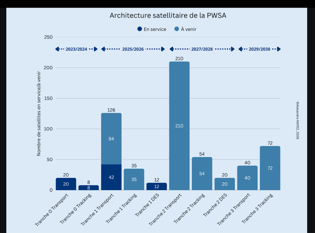 L’émergence de la PWSA et du projet Golden Dome for America traduit une transformation profonde de la défense antimissile américaine, reposant désormais sur l’espace comme infrastructure opérationnelle. Conçue par la Space Development Agency (SDA), la PWSA repose sur une constellation de satellites en orbite basse, et est divisée en différentes Tranches numérotées, elles-mêmes organisées en plusieurs Layers selon les fonctions des satellites. Sur le plan opérationnel, les Tranches sont lancées tous les deux ans depuis 2023 (Tranche 0), et les projets actuels de la SDA courent jusqu’à début 2034 (Tranche 5) (Weaver, 2024). Cette architecture proliférée, qui devrait compter à terme entre 400 et 500 satellites, rompt avec le modèle spatial hérité de la guerre froide, fondé sur un nombre limité de plateformes de grande valeur en orbite élevée, vulnérables et difficilement remplaçables. En privilégiant la prolifération, la redondance et la latence réduite, elle vise à garantir la persistance des capacités de commandement et de contrôle (C2) dans un environnement spatial contesté.