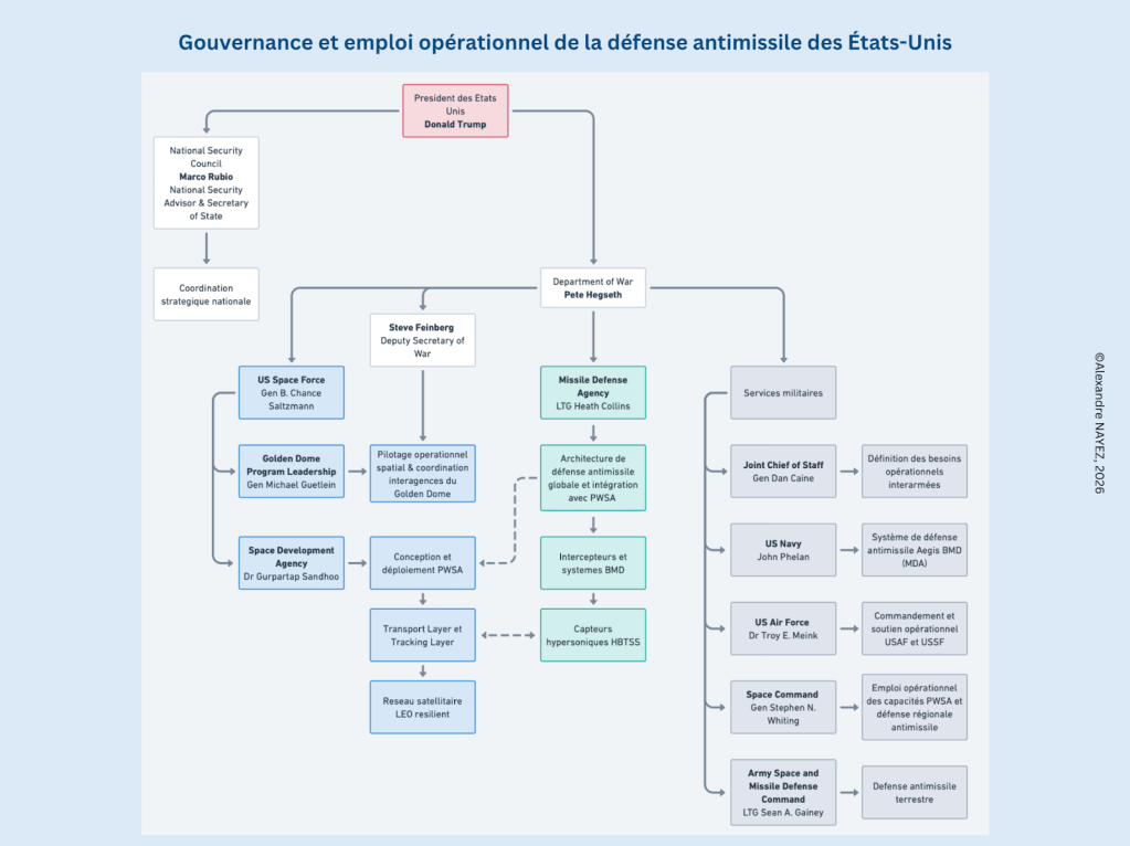 La mise en œuvre de cette architecture antimissile repose sur une gouvernance et une intégration technico-industrielle étroites. Concernant la PWSA, la SDA assure ainsi la conception et le déploiement de la constellation et sélectionne les industriels mettant au point les systèmes, tandis que la Missile Defense Agency (MDA) demeure responsable de l’architecture antimissile globale et de l’intégration des capteurs dans les systèmes d’interception. L’U.S. Space Force joue un rôle central dans l’opérationnalisation de ces capacités, également sous l’autorité du Department of War, tandis que les grands maîtres d’œuvre industriels et les acteurs du New Space participent à l’accélération des cycles d’innovation et à la réduction des coûts. Cette hybridation institutionnelle et industrielle reflète l’ambition d’une architecture globale, résiliente et évolutive, capable de soutenir une défense antimissile se voulant adaptée aux contraintes d’un environnement stratégique en mutation.